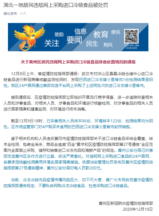 龙商网消息: 12月11日,据湖北发布微信公众号消息,12月8日上午,湖北省疫情防控指挥部通报:武汉市对洪山区昌晶冷链仓储中心进口冷链食品进行新冠病毒核酸监测检测时,发现巴西进口冷冻猪小里脊肉1份检测结果呈阳性。黄冈市黄州区24户居民通过美团优选平台...