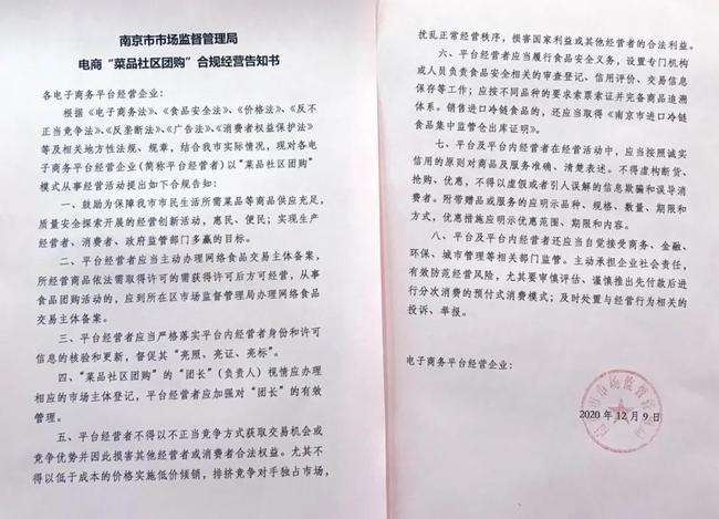 社区团购“团长”要视情办理相应的市场主体登记,平台经营者应加强对“团长”的有效管理;平台经营者不得以低于成本的价格实施低价倾销,扰乱市场秩序;销售进口冷链食品的,应当取得《南京市进口冷链食品集中监管仓出库证明》……12月9日,南京市市场监管局发布《电商“菜品社区团购”合规经营告知书》,对各电子商务平台经营企业以“菜品社区团购”模式从事经营活动提出合规告知。