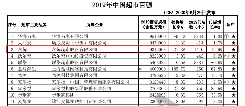 据今年6月29日中国连锁经营协会发布的2019年《中国超市百强》显示,永辉超市以931.5亿的销售额排在百强榜中第3位。