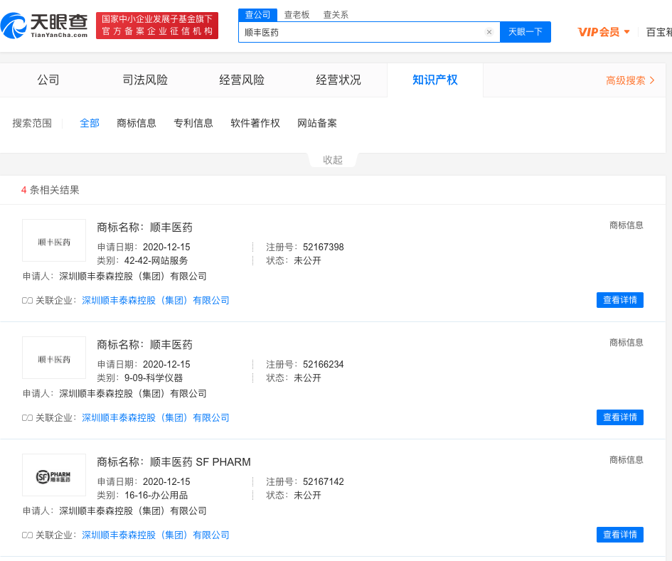 天眼查App显示,近日,深圳顺丰泰森控股(集团)有限公司新增多条“顺风医药”商标信息,涉及的国际分别包含网站服务、广告销售、运输贮藏等,目前商标状态为“商标申请中”。深圳顺丰泰森控股(集团)有限公司成立于2008年8月,注册资本为20.1亿人民币,法定代表人为王卫,经营范围包含投资兴办实业(具体项目另行申报);供应链管理;资产管理等。该公司由顺丰控股股份有限公司全资持股。