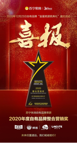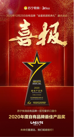 2020年12月23日,经过三个多月的激烈角逐和专业评审,第四届全球自有品牌产品亚洲展-中国自有品牌评选“金星奖”公布获奖名单。颁奖现场,苏宁快消自有品牌营销及乐可爱手口湿巾分别斩获“2020年度自有品牌整合营销奖”及“2020年度自有品牌最佳产品奖”2项大奖。苏宁这一年来在开发及推广自有品牌的努力,得到了业内充分肯定。