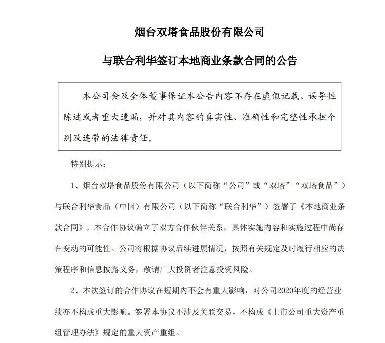 龙商网消息: 双塔食品公告称,公司与联合利华决定在植物基蛋白为主要原料的产品的生产、销售方面建立全面、深入的合作关系,达成业务合作,签署了《本地商业条款合同》。...