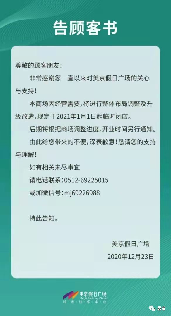 日前,苏州相城美京假日广场正式发出告顾客书,门店将于2021年1月1日起临时闭店。有消息称,王府井要接盘该项目,不过官方目前尚未公布任何相关信息。据悉,美京假日广场于2019年9月28日开业,项目体量19万方,项目主体建筑包括一座购物中心和五星级铂尔曼酒...