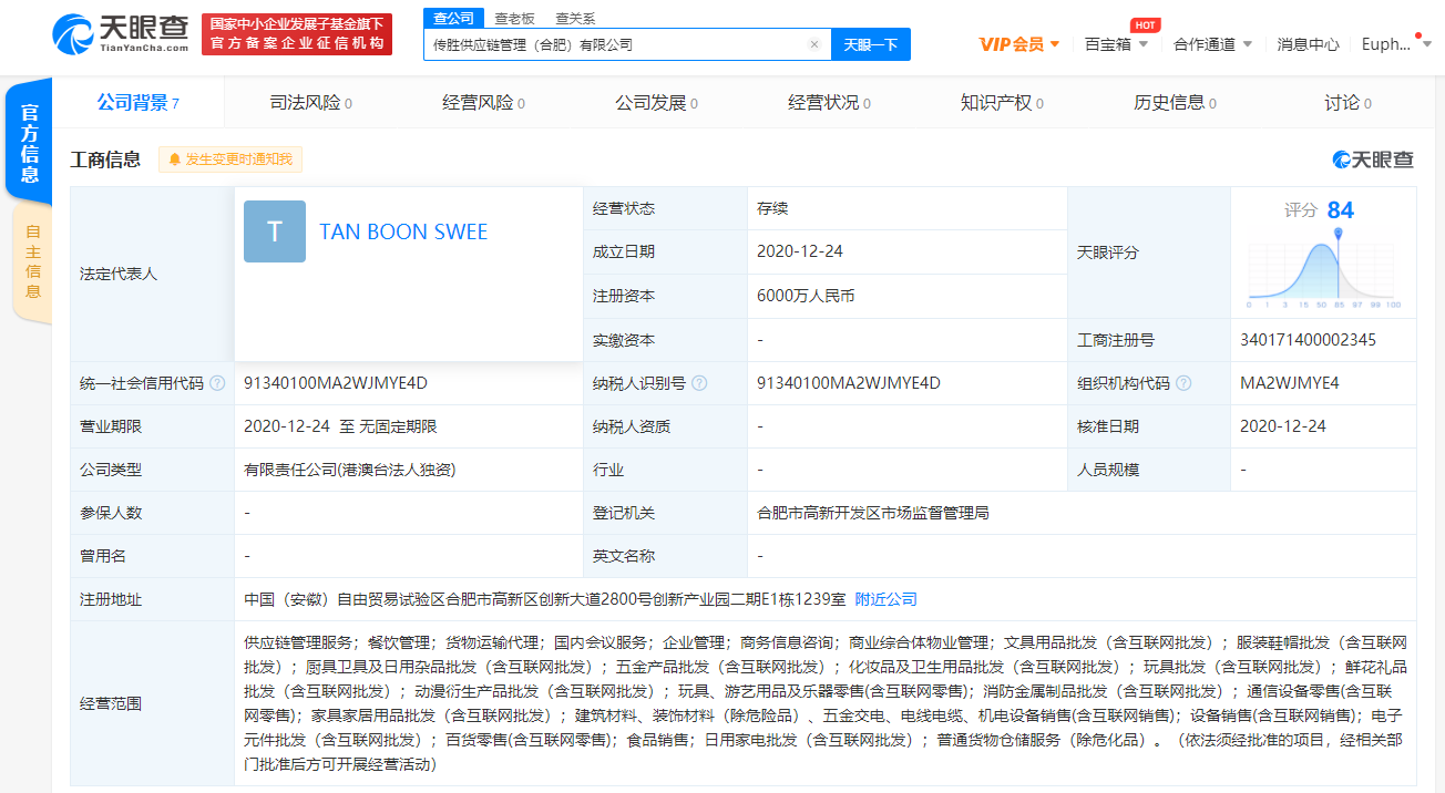 天眼查App显示,12月24日,传胜供应链管理(合肥)有限公司成立,该公司注册资本6000万人民币,法定代表人为TAN BOON SWEE,经营范围包含:供应链管理服务;餐饮管理;货物运输代理;国内会议服务;企业管理;商务信息咨询;商业综合体物业管理等。该公司由...