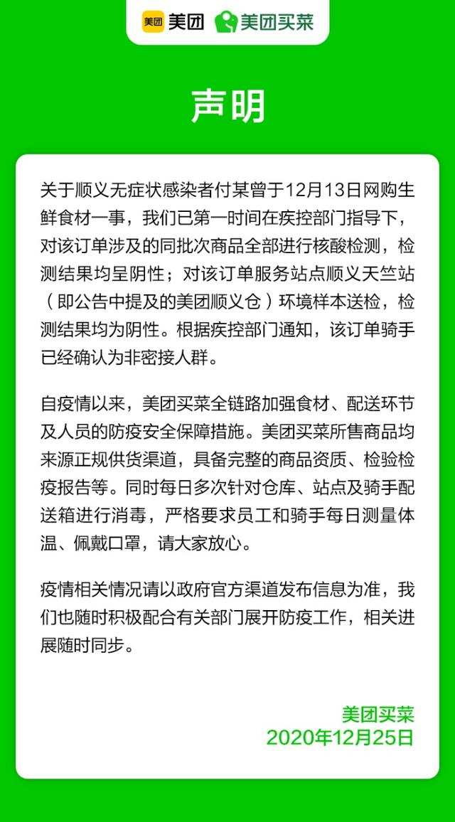 关于北京顺义无症状感染者付某曾于12月13日网购生鲜食材一事,美团买菜表示,已第一时间在疾控部门指导下,对该订单涉及的同批次商品全部进行核酸检测,检测结果均呈阴性;对该订单服务站点顺义天竺站环境样本送检,检测结果均为阴性。另根据疾控部门通知,该订单骑手已经确认为非密接人群。