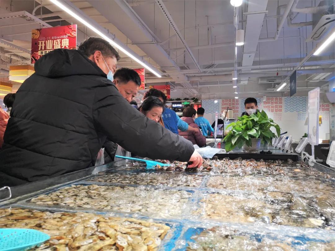 在他看来,盒马的特色之一——大龙虾、帝王蟹等鲜活大海鲜,就是传统菜市场鲜少售卖的品类,在即将到来的新年春节,这些商品能够满足消费者升级家中餐桌的需求。开业当天,鲜活水产区意料之中成为最热闹的区域之一。消费者们围站在品种多样的水产前,仔细挑选,一次性下手好几样的不在少数。