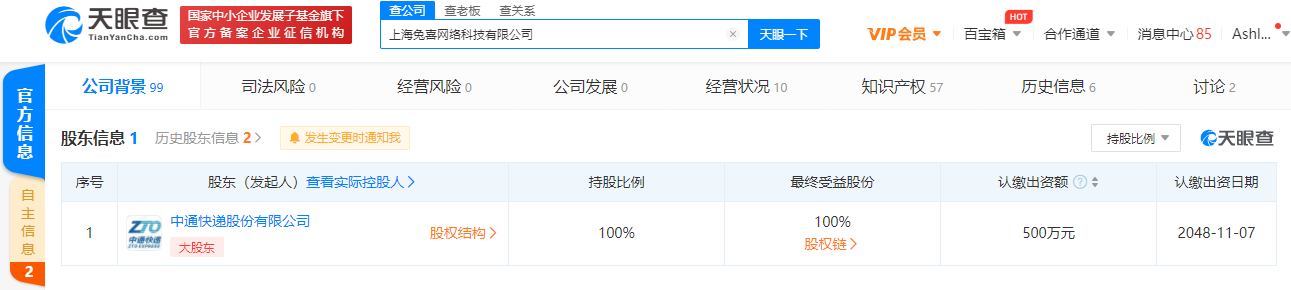 天眼查App显示,12月28日,上海兔喜网络科技有限公司发生工商变更,原股东浙江博誉信息技术有限责任公司退出,新增股东中通快递股份有限公司,持股100%。上海兔喜网络科技有限公司成立于2018年11月,注册资本500万人民币,法定代表人王卫华,经营范围包含从事网络科技、计算机技术领域内技术开发、技术咨询、技术服务、技术转让,国内快递(邮政企业专营业务除外)等。