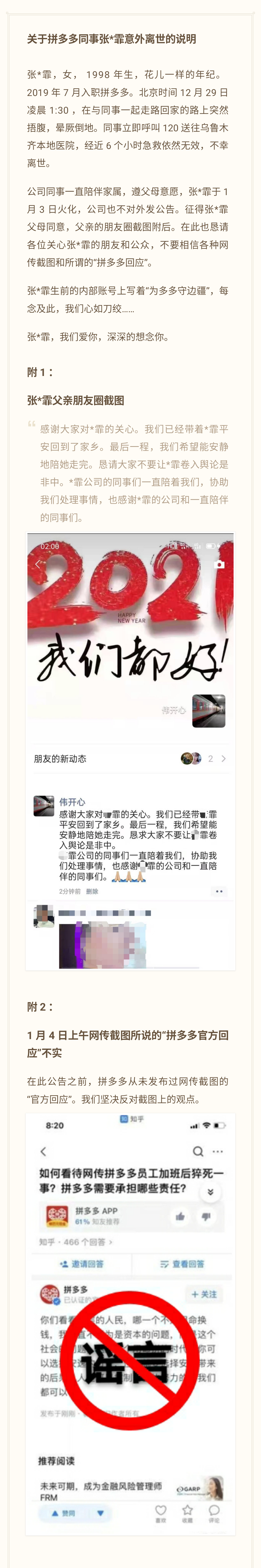 拼多多发布关于拼多多同事张*霏意外离世的说明。拼多多称,离世员工张*霏2019年7月入职拼多多。说明指出,遵其父母意愿,张*霏于1月3日火化,公司也不对外发公告,征得张*霏父母同意,父亲的朋友圈截图附后,在此也恳请各位关心张*霏的朋友和公众,不要相信各种网传截图和所谓的“拼多多回应”。在此公告之前,拼多多从未发布过网传截图的“官方回应”,我们坚决反对截图上的观点。