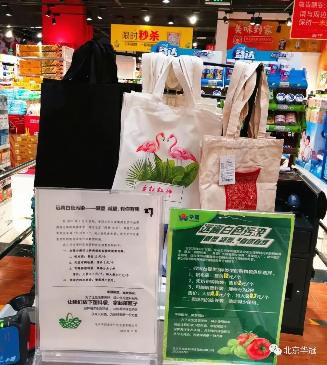 据了解,华冠公司自北京“限塑10条”征求意见稿发布开始,就已经开始着手联系供应商准备塑料袋替换等相关事项,并于北京最新“限塑令”颁布之后,全面推行使用可降解塑料袋、无纺布购物袋以及帆布袋来替换原有塑料袋。自2021年1月1日起,已完成全面替换工作,并通过在显眼位置张贴宣传标语、店内广播宣传等形式,推荐消费者自带袋子或在店内购买新的可降解购物袋。