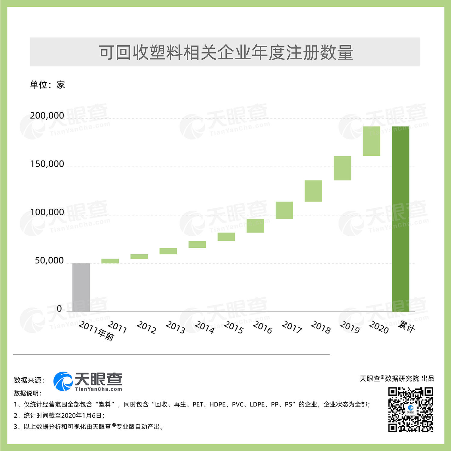 天眼查专业版数据显示,自2008年限塑令开始实施起的十二年期间,我国可回收塑料相关企业注册总量(全部企业状态)由原来的4万家增长至19万家。值得注意的是,2016年相关企业年注册增速高达17%,之后四年增速均保持在18%以上。以工商登记为准,我国2020年新增...
