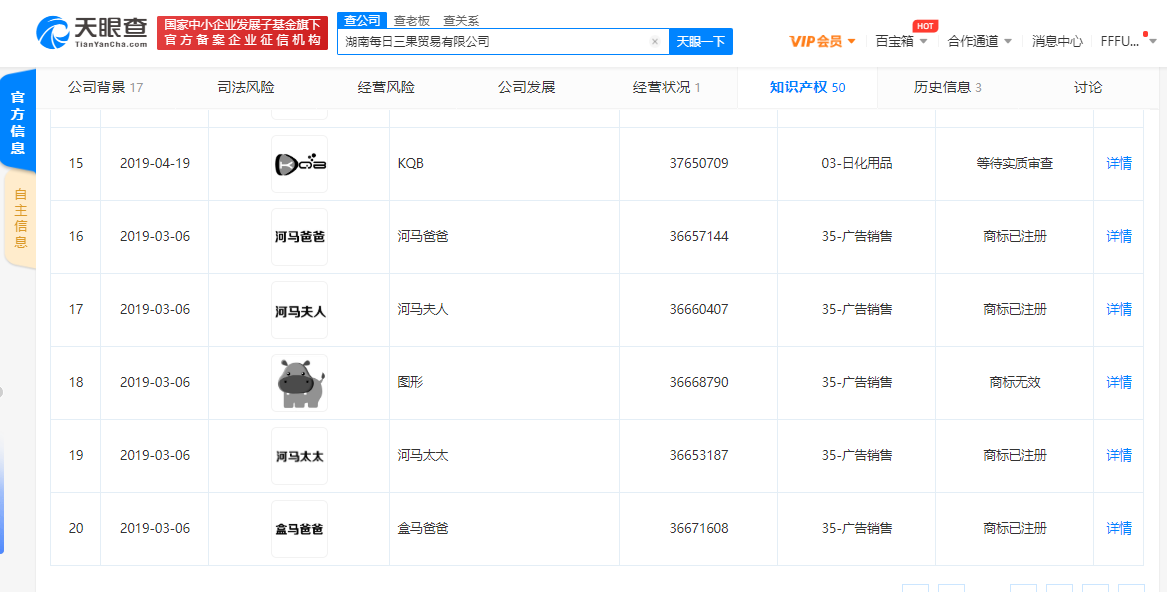 1月12日,盒马生鲜官微发布称,盒马生鲜竟然还有“盒马夫人、盒马小姐、盒马爸爸、盒马兄弟”这些亲戚。天眼查App显示,“盒马夫人”“盒马爸爸”商标持有人为湖南每日三果贸易有限公司;“盒马兄弟”商标持有人为香港品牌集众管理有限公司。而与“盒马小姐”关联的公司则是哈尔滨市香坊区盒马小姐咖喱屋,但该公司已处于注销状态。