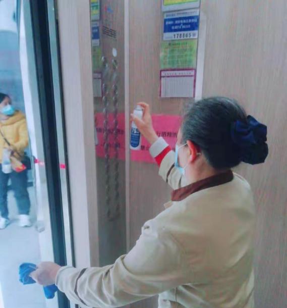 ▲民治优城购物中心工作人员对电梯间进行消杀。