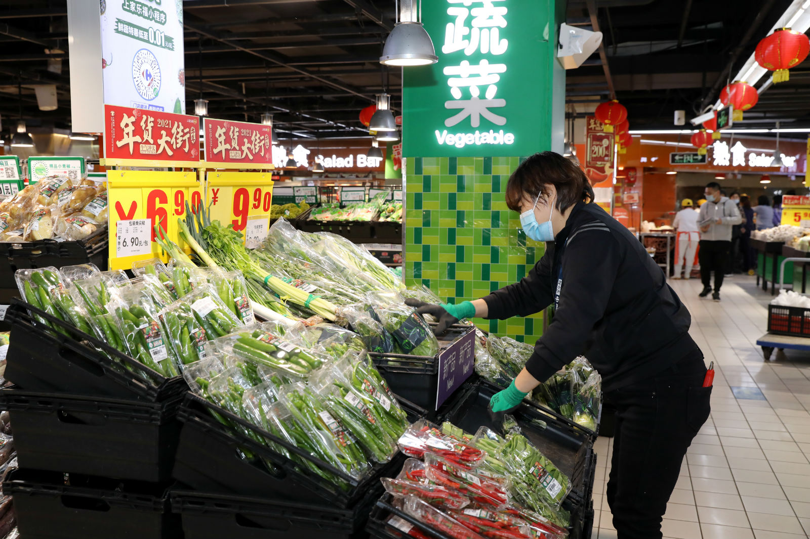 ▲超市工作人员佩戴手套、口罩整理商品,避免直接接触。