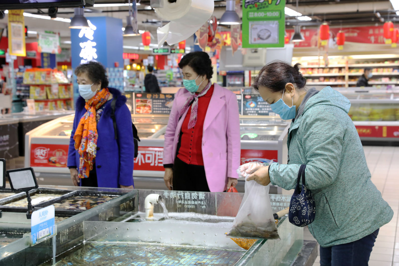 ▲顾客佩戴一次性手套选购水产品。