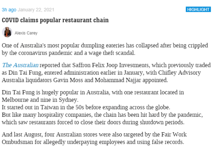 因为疫情的打击,以及欠薪、低薪丑闻,澳洲最著名的中餐连锁,鼎泰丰已经宣布破产。