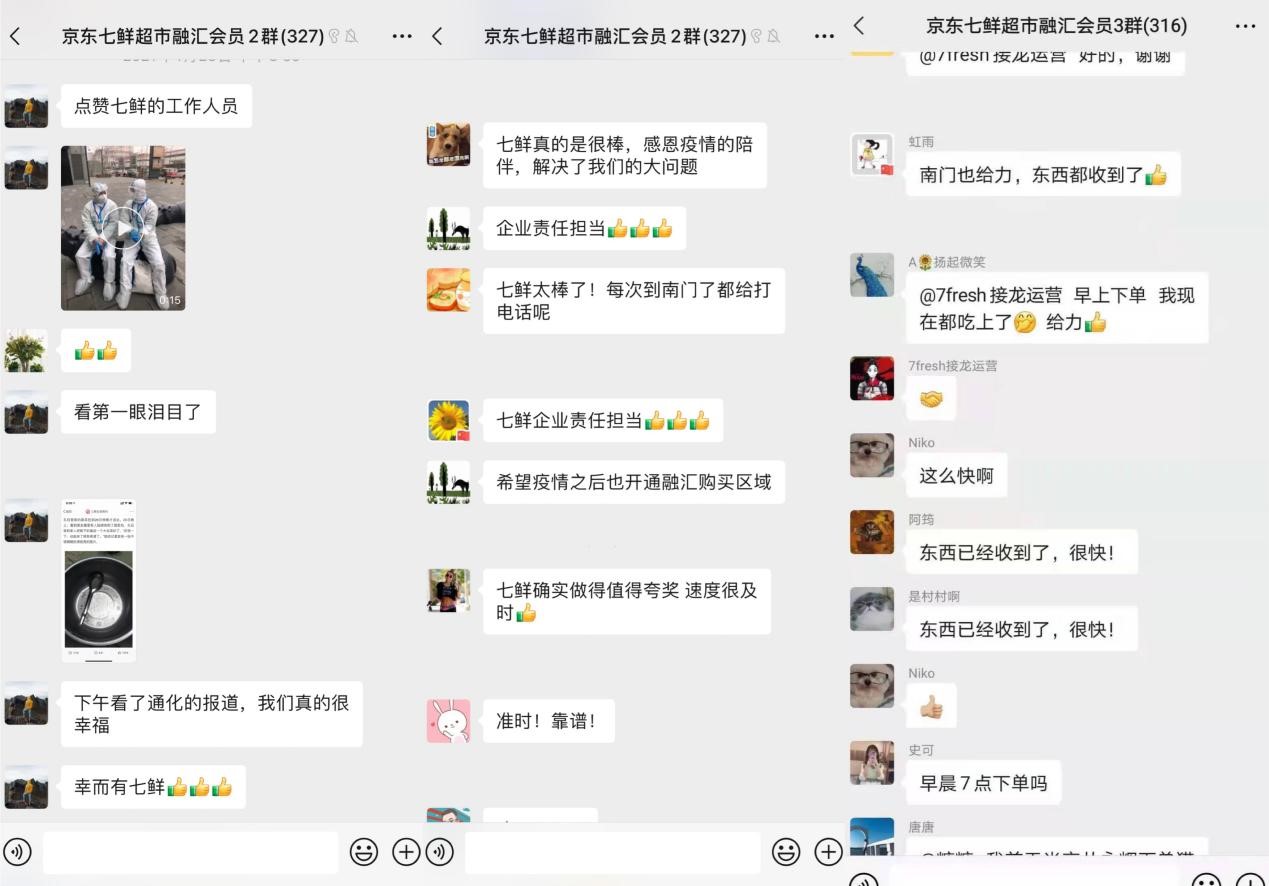为了更及时地了解社区居民的需求,“七鲜社区微信群”也相继建立。短短一上午时间,四、五个500人大群相继加满。群内居民的声音传递着感动和鼓励,这也让七鲜超市一线员工感受到一切辛苦和坚持都是值得的。