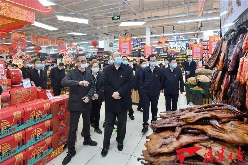 尹力、王宁等省市领导一行在张轩松的陪同下,深入了解超市线上线下销售和仓储情况,详细查看生鲜水产、肉类和乳制品等货品质量价格,并亲切慰问假期坚守岗位的超市快递小哥们。尹力、王宁叮嘱永辉超市要精心组织货源,稳定市场价格,保障节日期间的商品供应。
