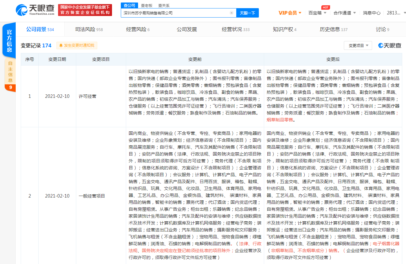 天眼查App显示,近日,苏宁易购关联公司深圳市苏宁易购销售有限公司发生工商变更,许可经营新增“烟草制品零售”,一般经营项目新增“电子烟雾化器(非烟草制品、不含烟草成分)销售”。深圳市苏宁易购销售有限公司成立于2001年6月,由苏宁易购集团股份有限公司持股100%,疑似实控人为张近东。