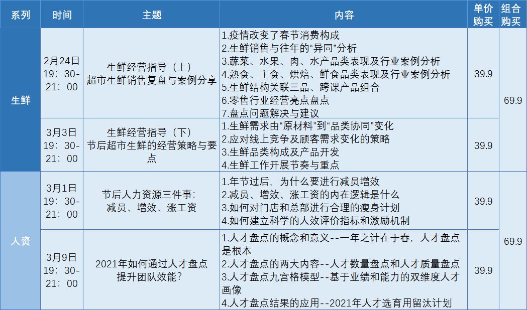 PS:以上课程请通过扫描以下图片二维码购买 生鲜经营指导合并购买链接: 减员增效+人才盘点合并购买链接: 更多课程信息请咨询各大区联系人 四川、重庆、福建、浙江 刘老师:13521999487 河北、陕西、山西、青海 李老师:18310500064 河南、吉林、西藏 刘老师:...