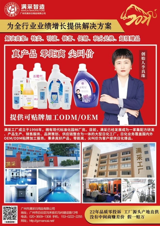 据悉,成立于1998年的广州市满采日用品有限公司,拥有现代标准化园林厂房,作为一家集配方研发、产品生产、销售服务、品牌策划、供应链整合为一体的大型日化工厂,日化业务覆盖国内外OEM/ODM贴牌加工服务。