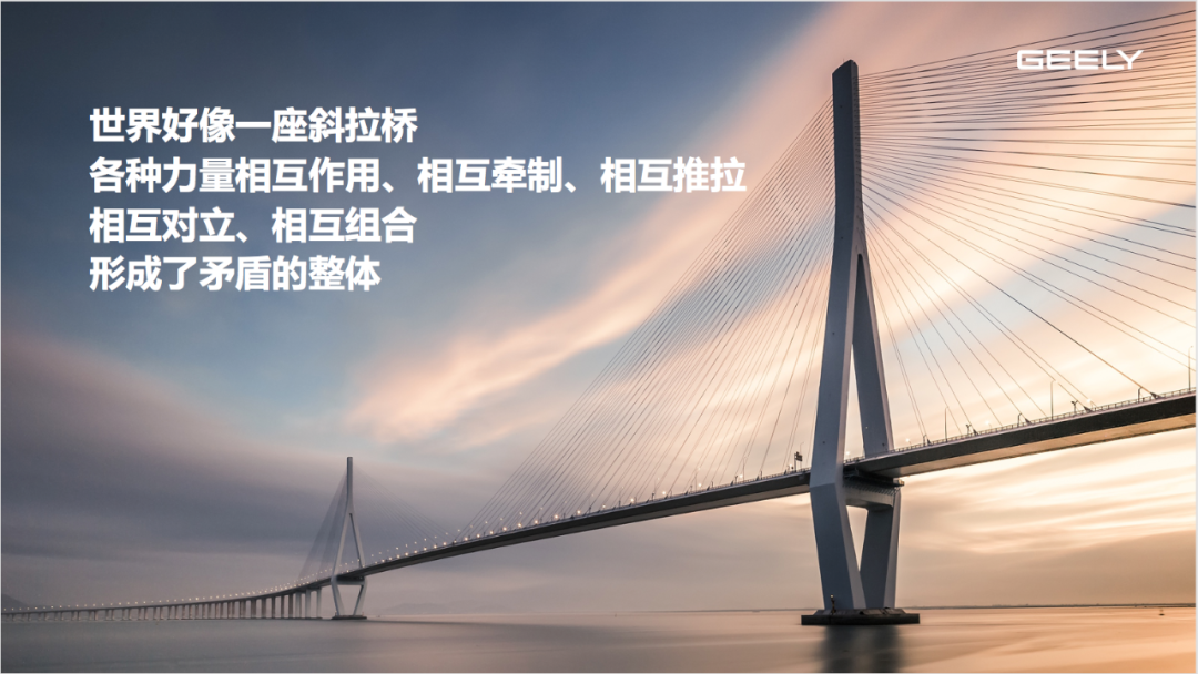 世界好像一座斜拉桥,各种力量相互作用、相互牵制、相互推拉、相互对立、相互组合,形成了矛盾的整体。大家都在相互寻找战略平衡,共同维护彼此关切,尽力保证世界和平稳定。这种矛盾的平衡构成了人类社会走向更加美好明天的基础,我称之为“斜拉桥”。