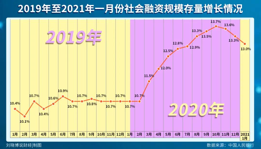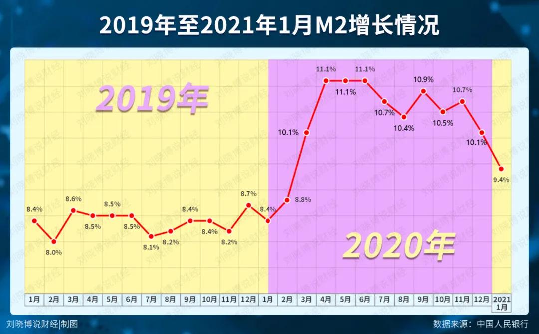 比如上图,我多次给大家看过,是2019年以来广义货币M2的走势图,2020年的增速飙升是因为要对冲疫情,而回落是因为控制住了疫情。