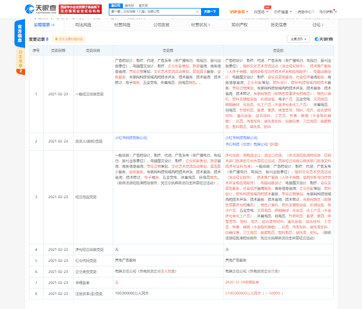 天眼查App显示,2月23日,薯一薯二文化传媒(上海)有限公司发生多项工商变更,注册资本从100万人民币增至5100万人民币,增幅5000%。公司经营范围新增货物进出口;组织文化艺术交流活动;销售汽车配件等。同时,股东新增书行科技(北京)有限公司,持股比例9.09%,为第二大股东。”薯一薯二”成立于2020年5月,法定代表人为曾秀莲,第一大股东为小红书科技有限公司,持股比例90.91%。