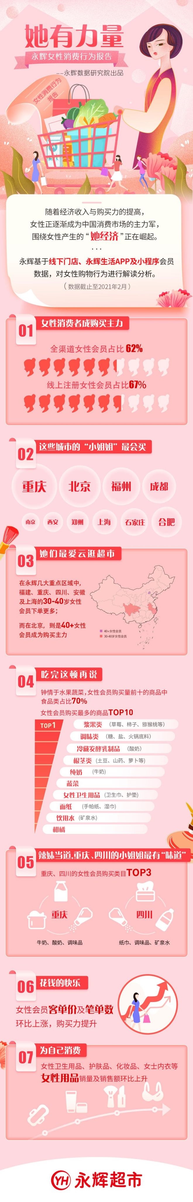 永辉基于线下门店、永辉生活APP及小程序会员数据,对女性购物行为分析得出,女性消费者成购买主力,其中全渠道女性会员占比62%,线上注册女性会员占比67%。