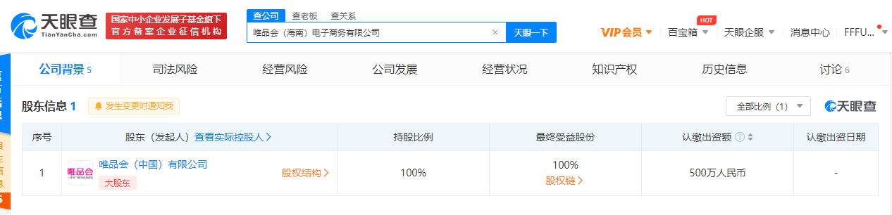 天眼查App显示,3月15日,唯品会(海南)电子商务有限公司成立,注册资本500万人民币,法定代表人为沈亚,经营范围包括许可项目货物进出口、技术进出口、互联网销售、创业投资、国内货物运输代理等。股东信息显示,该公司由唯品会(中国)有限公司100%持股。
