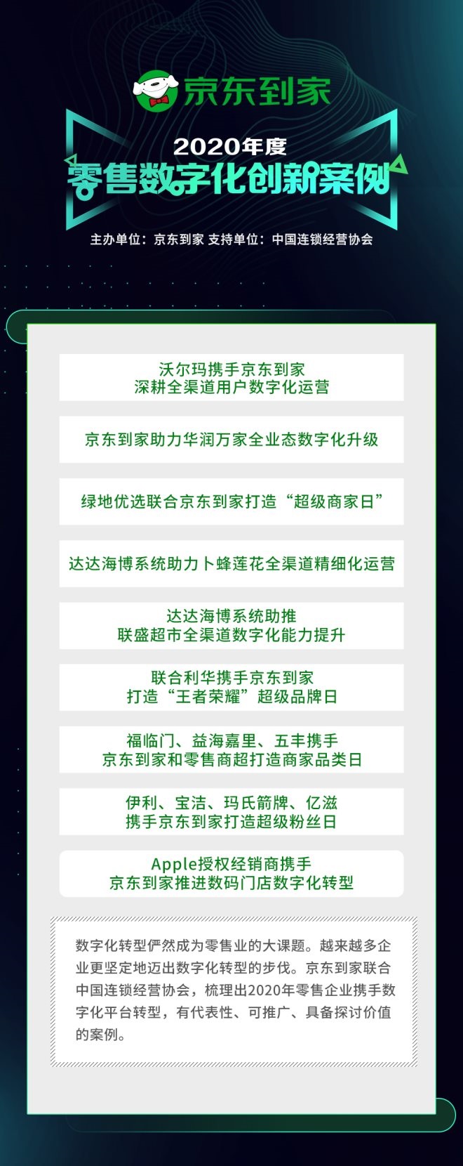 经过2020年的全盘实践和检验,在坚持“不碰货,只赋能”的理念加持下,旗下京东到家即时零售平台与达达快送即时配送平台协同,在助力零售商、品牌商的数字化转型已积累了大量成功经验。