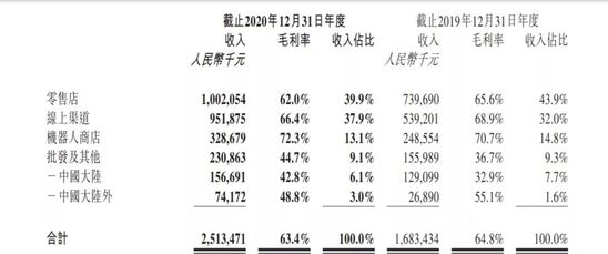 线下渠道的收紧与疫情有很大关系,但也能看到公司在策略上的选择。2020年新开业76家线下门店,从2019年末的114家增至2020年末的187家,同时新增了526家机器人商店,从2019年末的825家增至2020年末的1351家。相比开“大店”,机器人商店不需要请员工,拥有成本优势,并且可以打破消费场景的桎梏,深入地铁站、电影院等场景,更容易布局下沉市场。