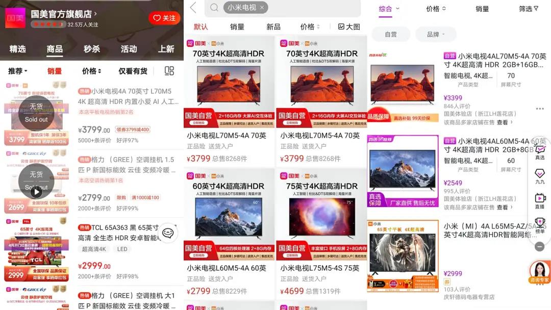 真快乐APP就像一个大杂烩,把直播、短视频、导购、拼团、抽奖等各种电商网红元素都汇聚到了一起,但互相之间并没有碰撞出一个化学反应。那它的优势在哪里?「电商在线」发现,相较于国美在天猫、京东、拼多多上开的旗舰店,真快乐APP的价格更低、货品更多、配送范围更广。