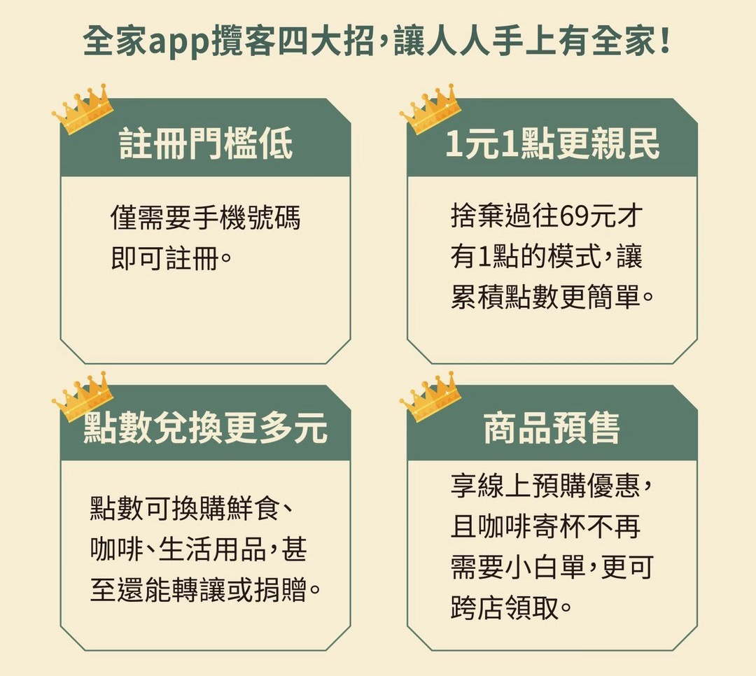 一般来说,品牌经营会员通常有几大目的:提升回购率、建立品牌认同、透过口碑或社群来获取新客。以台湾全家便利为例,会员服务的几个基本原则:符合消费者需求、美好的体验感、高度便利性,只有尽可能扩大供需面的交集,交易才会发生、营业额才会提升。