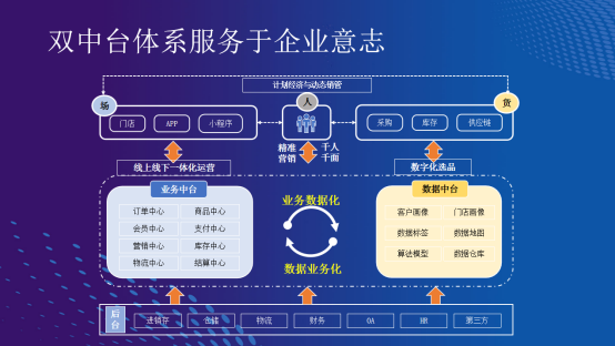 我们当时基于中台系统,81天完成了全域营销的CRM,以前的营销是分散在各个部门业务之间的,我们通过中台的方式,快速的搭建全企业之间营销的体系。营销未来也是企业发展的重点,因为我们在整个的发展过程里面可以看到,营销大概在5—10年内是每一个零售企业都必须关注的重点,这个是竞争的最核心源头。