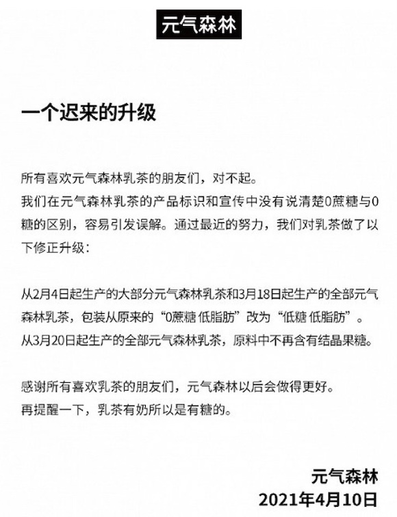 这封题为“一个迟来的升级”道歉信称,元气森林在乳茶的产品标识和宣传中没有讲清“0蔗糖”与“0糖”的区别,容易引发误解。最近元气森林对乳茶做了修正升级:一方面,从2月4日起生产的大部分元气森林乳茶和3月18日起生产的全部元气森林乳茶,包装从原来的“0蔗糖低脂肪”改为“低糖低脂肪”;另一方面,3月20日起生产的全部元气森林乳茶,原料中不再含有结晶果糖。