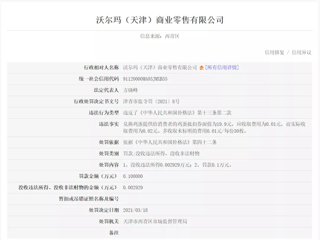 沃尔玛(天津)商业零售有限公司被罚没收违法所得29.29元;罚款1000元。