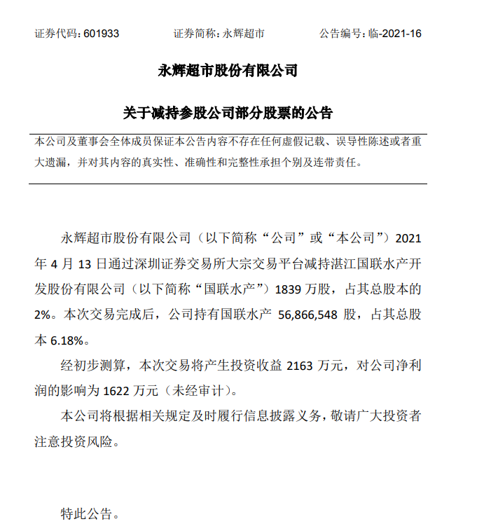 永辉超市公告,公司4月13日通过大宗交易平台减持国联水产1839万股,占其总股本的2%。交易完成后,公司持有国联水产总股本6.18%的股份。经初步测算,此次交易将产生投资收益2163万元,对公司净利润的影响为1622万元。