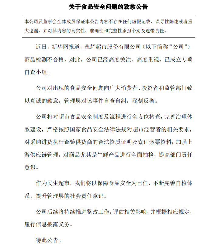 龙商网消息: 4月15日晚间,永辉超市公告称,近日,新华网报道,公司商品检测不合格,对此,公司已经高度关注、高度重视,已成立专项自查小组。公司对出现的食品安全问题向广大消费者、投资者和监管部门致以真诚的歉意,管理层对该事件自查自纠,深刻反...
