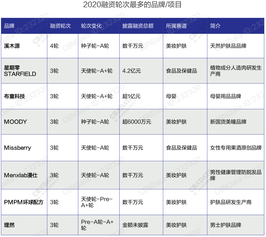2020年,不少消费品牌成长迅速,获得资本多轮押注。其中,天然护肤品牌溪木源一年内拿下4轮融资,成为2020融资轮次最多的品牌。