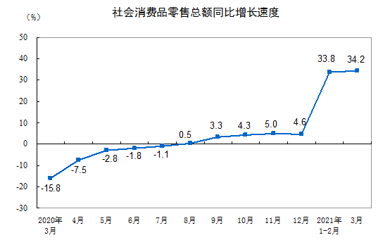 3月份,社会消费品零售总额35484亿元,同比增长34.2%;比2019年3月份增长12.9%,两年平均增速为6.3%。其中,除汽车以外的消费品零售额31554亿元,增长32.5%。扣除价格因素,2021年3月份社会消费品零售总额实际增长33%,两年平均增长4.4%。从环比看,3月份社会消费品零售总额增长1.75%。
