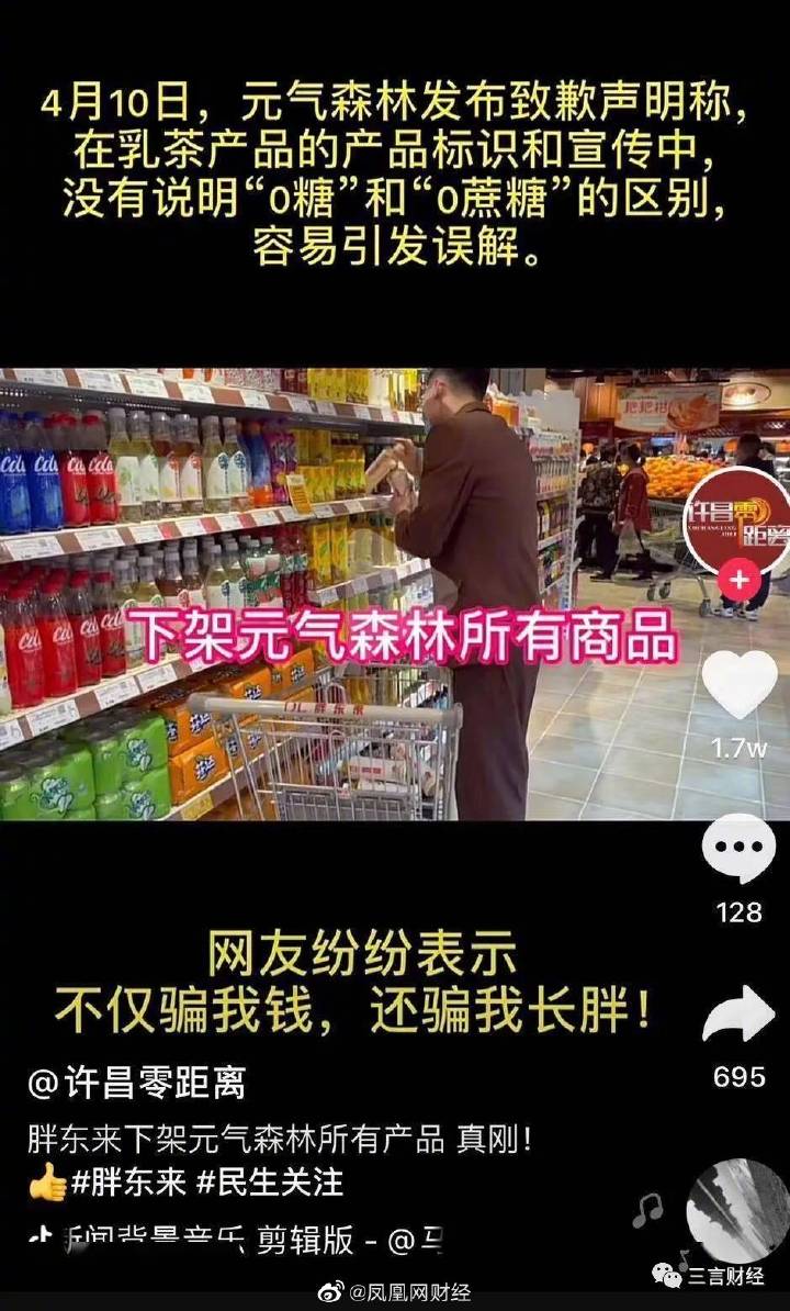 龙商网消息: 据许昌广电《许昌零距离》报道,目前河南零售巨头胖东来已经下架了元气森林相关产品,店员撤下了相关货架标签,元气森林产品被堆放在货架旁的小推车里。4月10日,元气森林发布致歉声明称,在乳茶产品的产品标示和宣传中,没有说明0糖和0蔗糖的...
