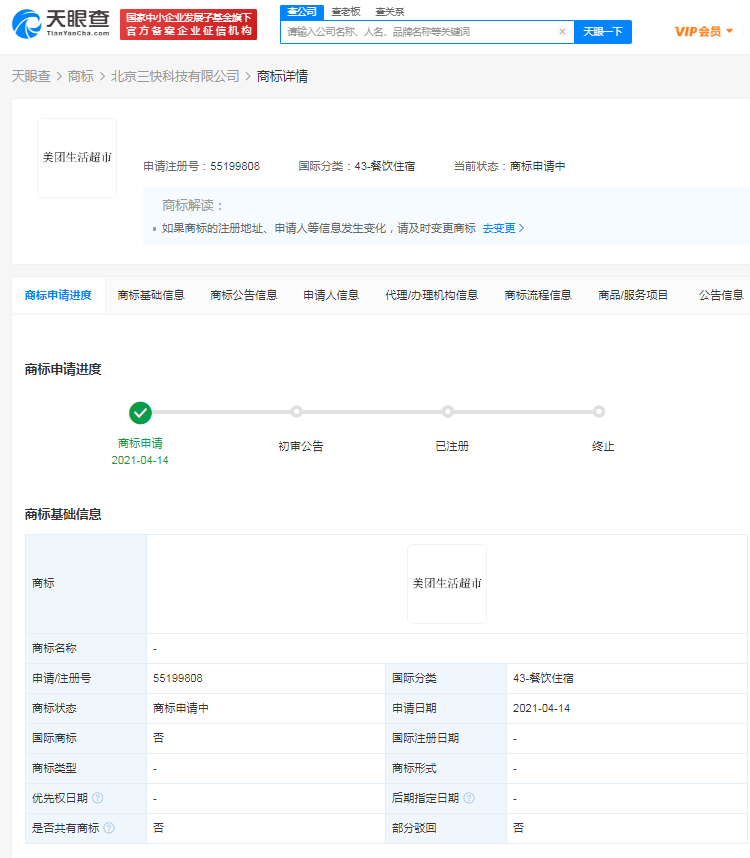 天眼查App显示,近日,北京三快科技有限公司申请美团生活超市商标,国际分类涉及办公用品、食品、餐饮住宿等,商标状态均为商标申请中。