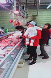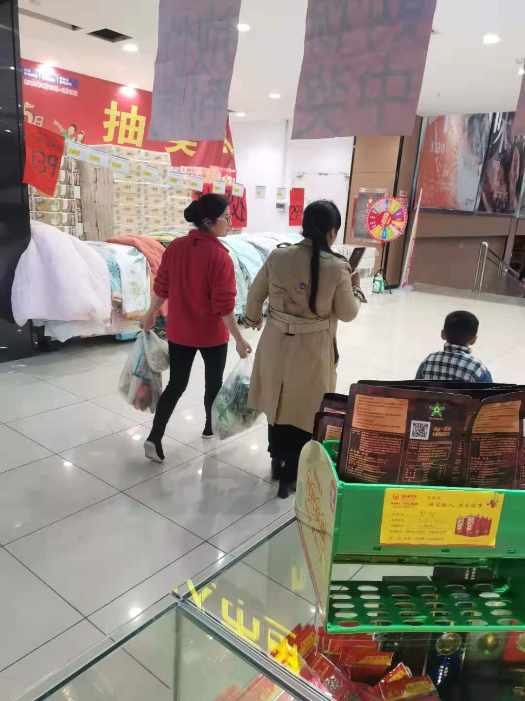 (穿红衣服的是佳惠的员工,帮顾客抱着小孩,方便顾客选购商品)