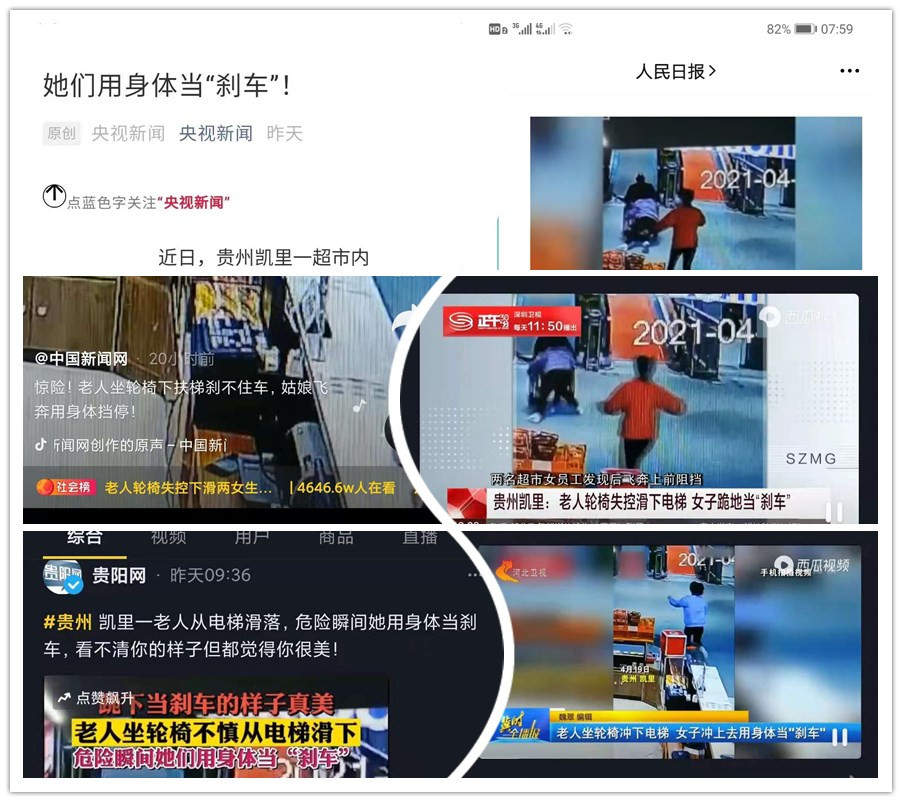 4月19日下午2点左右,一辆失控的轮椅带着老人在平步电梯上急速向下冲,佳惠超市凯里佳和店收银课的员工杨澄和烟酒柜的员工杨光珍,第一时间飞奔过去,用自己的身体当刹车,拦住了加速向下冲的轮椅,确保了轮椅平稳停住,保护了车上的老人安全。