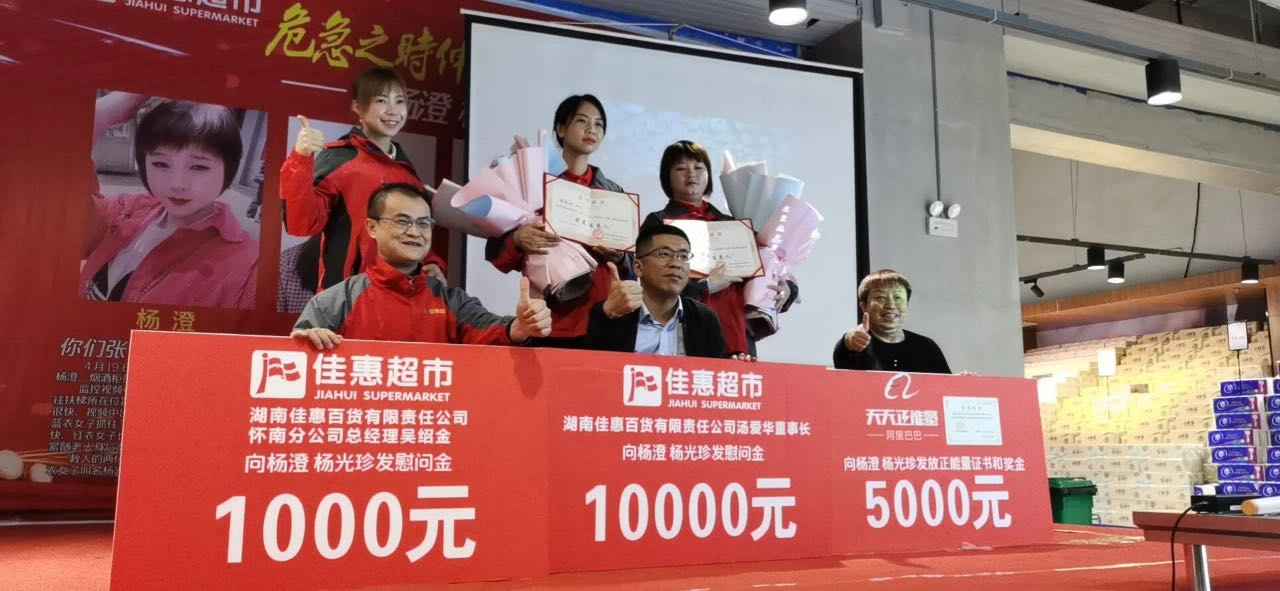 湖南佳惠董事长汤爱华对她们的勇敢行为给予了高度赞扬,随即给到两人10000元的正能量现金激励。她们用行动践行社会主义价值观,展现佳惠“顾客至上”的企业文化理念。