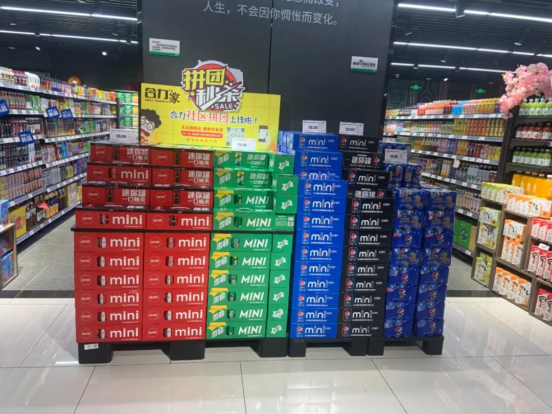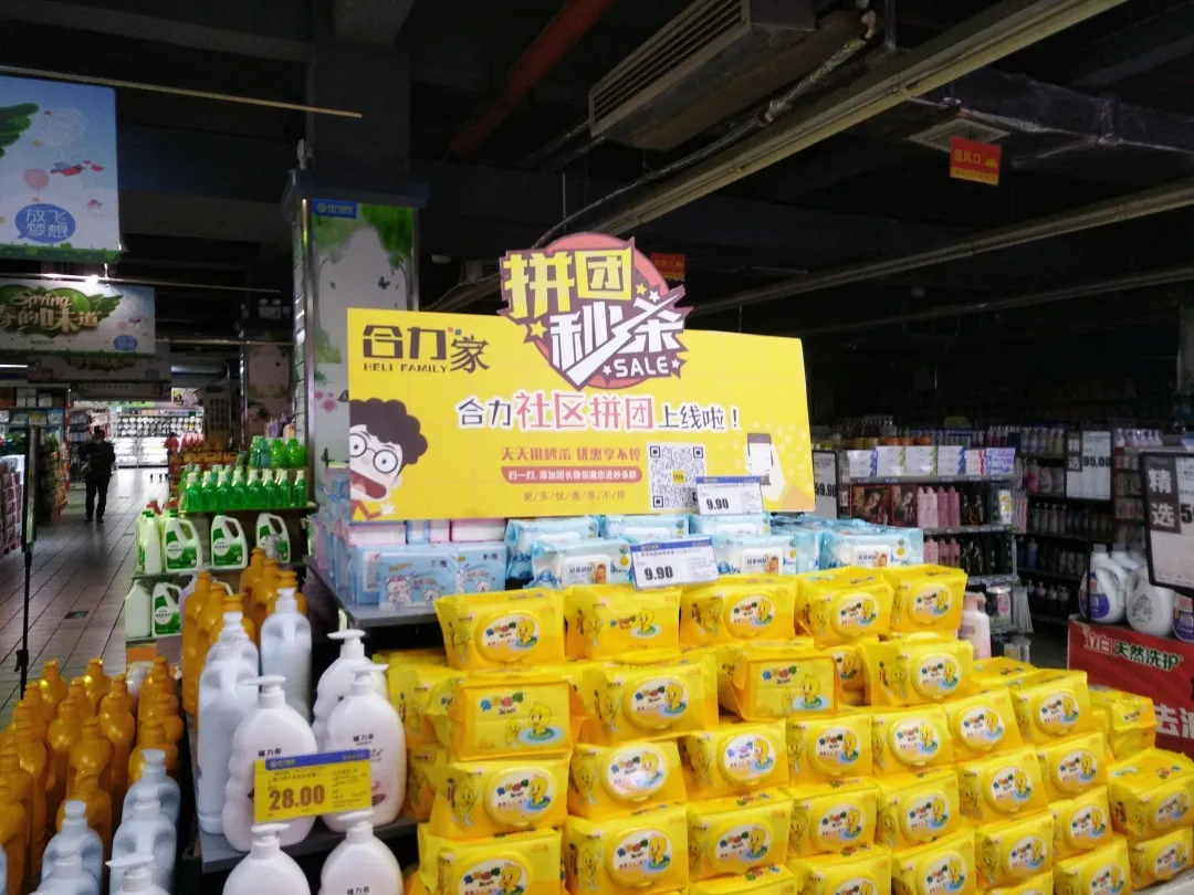 前期工作准备好了,提前预热也非常重要,为充分打响“合力超市优鲜到家”小程序的知名度,在拼团活动开始之前,合力超市就在线下铺设了宣传氛围物料,提前聚集了一波人气。