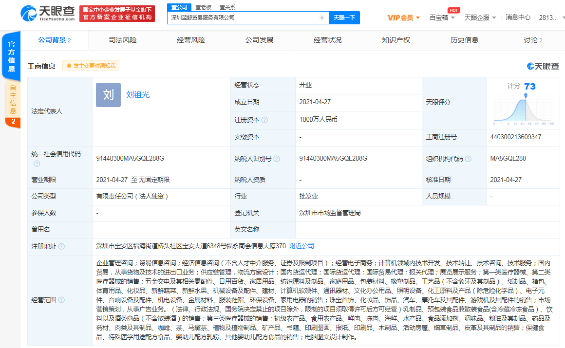 天眼查App显示,4月27日,深圳蓝鲸贸易服务有限公司成立,注册资本1000万人民币,法定代表人为刘祖光,经营范围含经营电子商务;国内贸易,从事货物及技术的进出口业务;供应链管理,物流方案设计;国内/际货运代理;日用百货销售等。股东信息显示,该公司由...