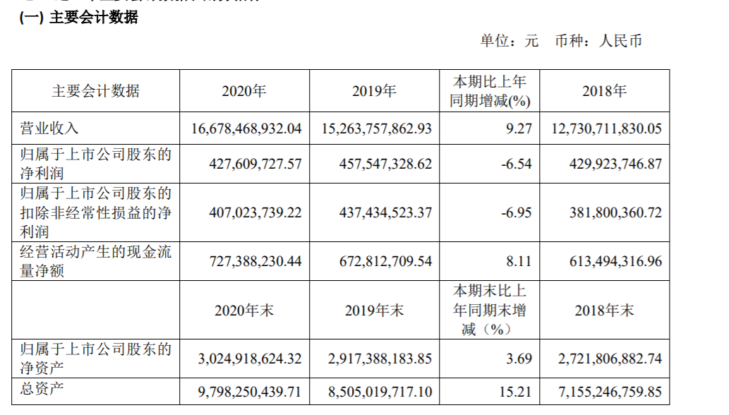 2020年年报显示,2020 年度,按新收入准则家家悦实现营业总收入 1,667,846.89 万元,同比增长 9.27%;本期、同期均按总额法可比口径,2020 年度营业总收入同比增长 17.90%;归属于上市公司股东的净利润 42,760.97 万元,同比下降6.54%;归属于上市公司股东扣除非经常性损益后的净利润 40,702.37万元,同比下降6.95%。