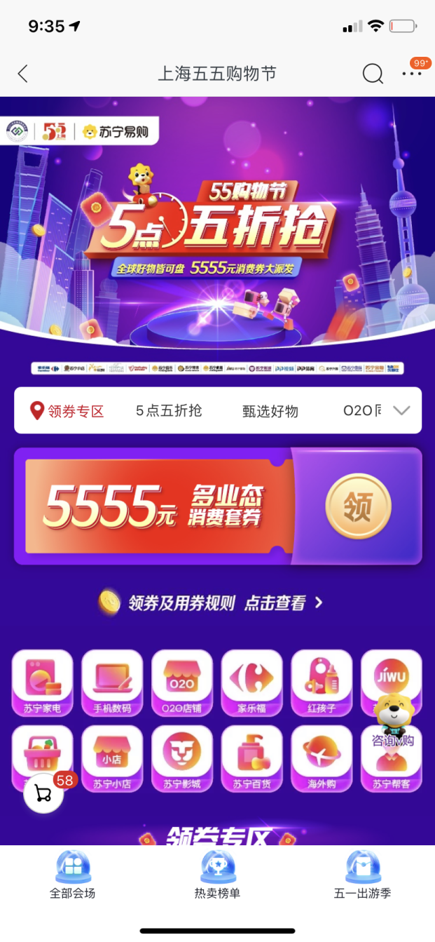 (苏宁易购在“上海五五购物节”期间,每位消费者都可领取5555元消费套券)