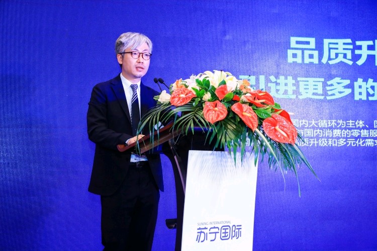 (图:首届消博会期间,苏宁家乐福商品副总裁陈尚斌在苏宁国际全球合作伙伴大会上发表演讲)